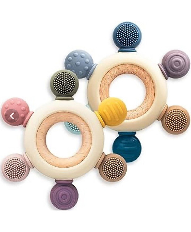 سیلیکون با بافت برجسته و انعطافپذیر، لثه را بهصورت ملایم آرام میکند و حلقه چوبی خوشدست، به تقویت قدرت گرفتن و هماهنگی حرکتی کودک کمک میکند. طراحی سبک، بهداشتی و قابلشستوشو، این محصول را به گزینهای مناسب برای استفاده روزانه تبدیل کرده است.