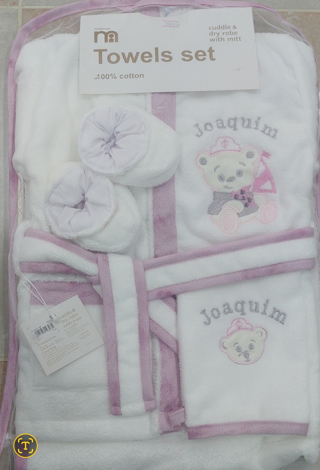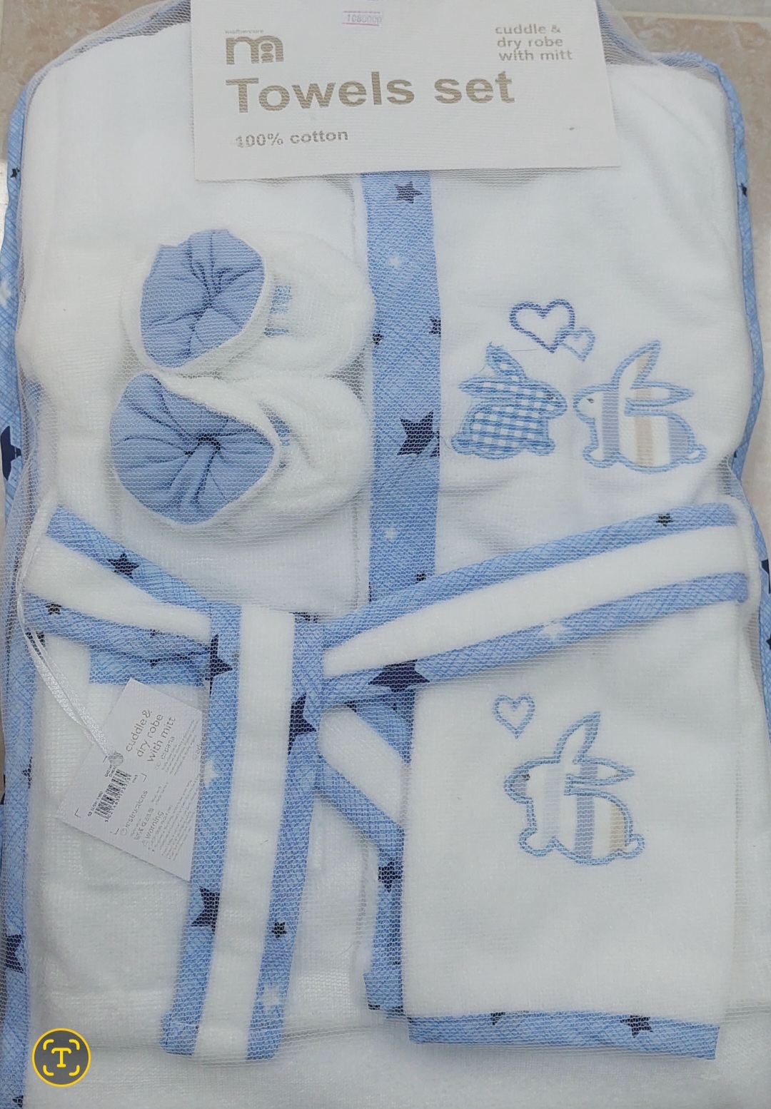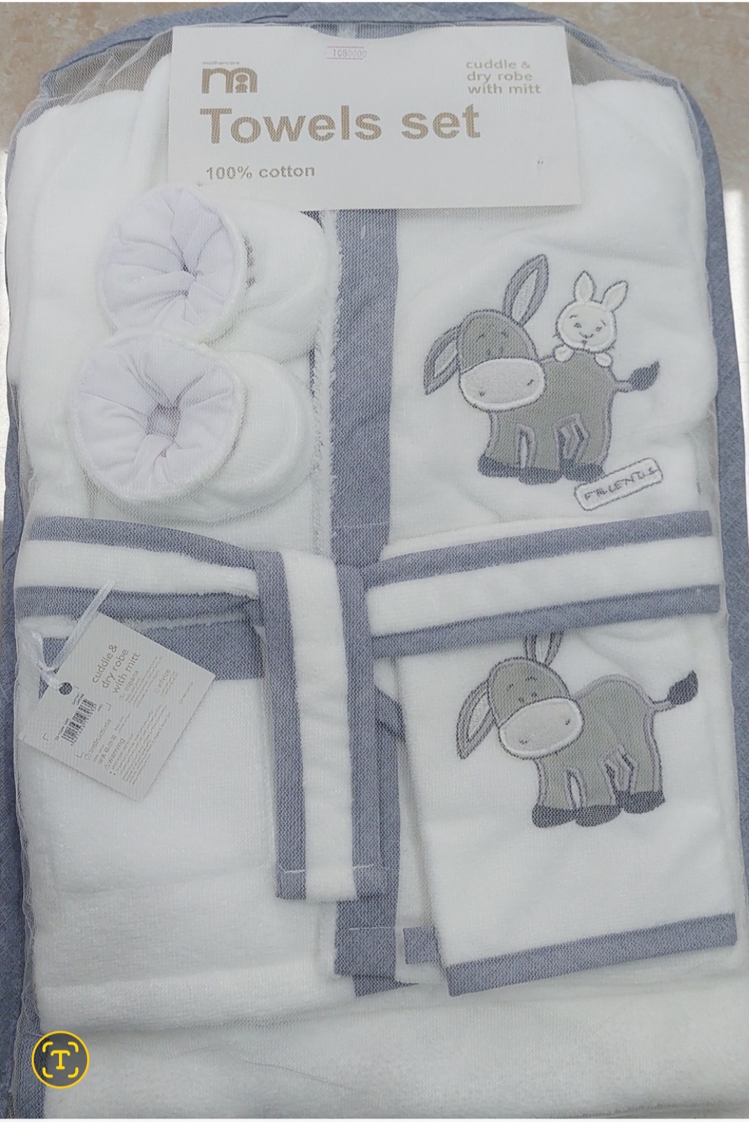 حوله پنج تیکه مادرکر ،طرح و رنگهای مختلف، شامل حوله تن پوش حوله کلاه دار ،لیف،پاپوش،حوله دست وصورت
